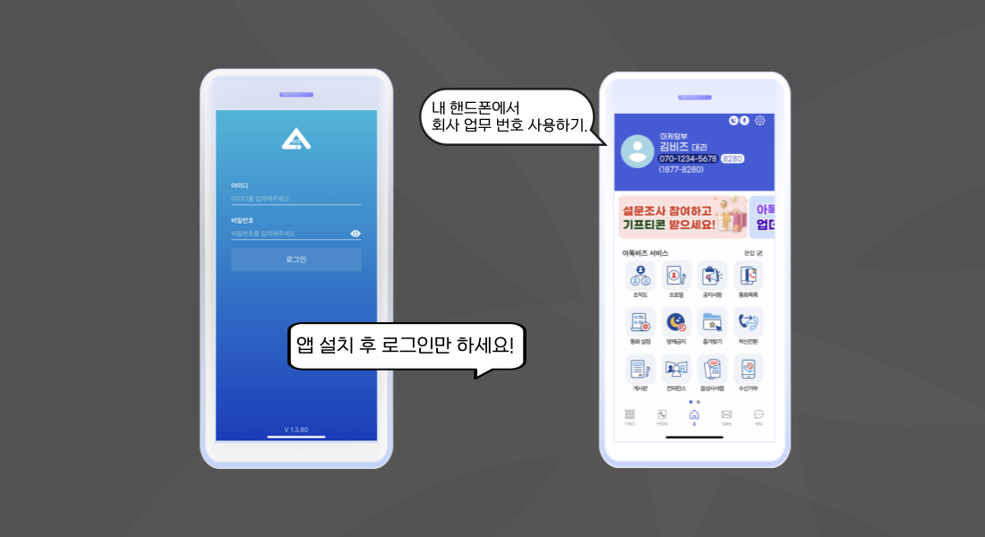 사용중인 핸드폰에서 앱(APP) 설치 후 로그인만 하면 내 핸드폰으로 회사 번호를 사용하실 수 있기 때문입니다.