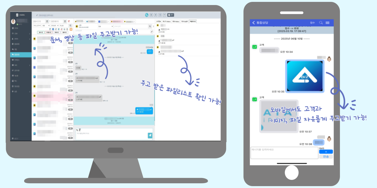 아톡비즈 통합 채팅상담은 모바일, PC에서 동일하게 이용이 가능하며