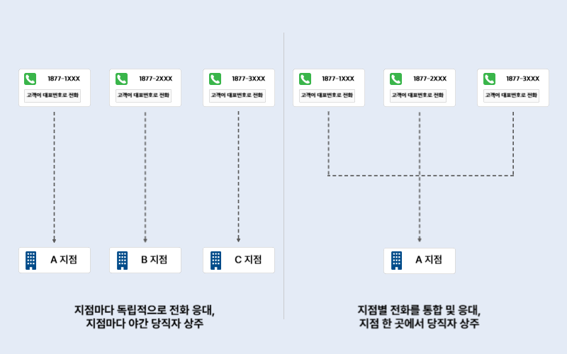 호텔, 쇼핑몰, 일반기업 등 야간에 업무량과 통화량이 적은 경우 각 지점별로