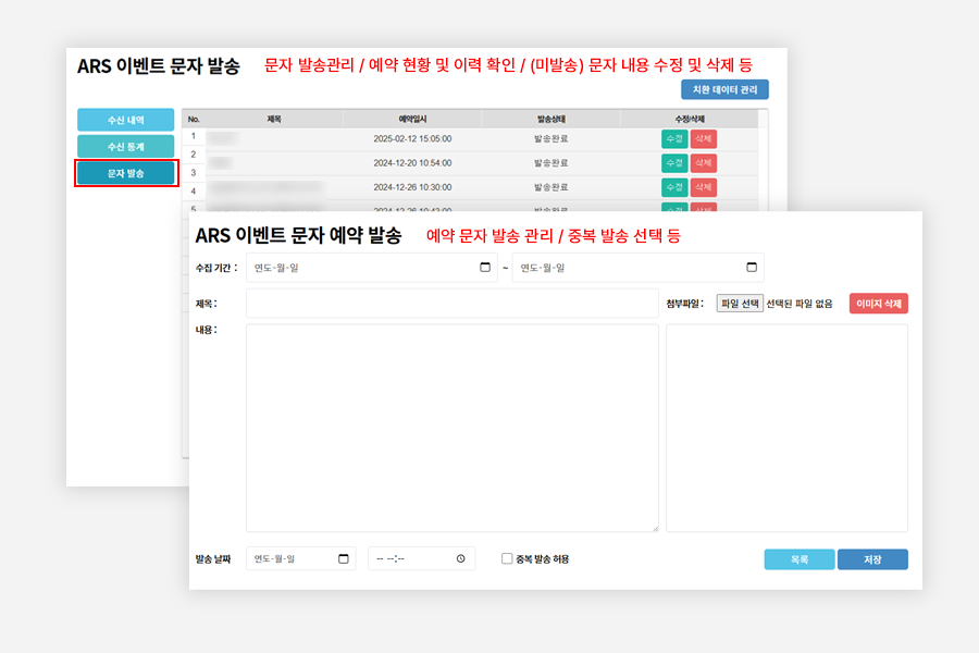 발송 예약 현황, 이력 확인부터 미발송건에 대한 내용 수정이 가능합니다.
