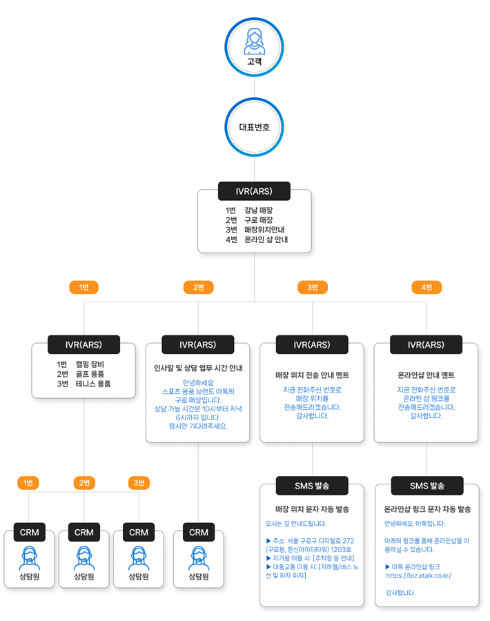 ② 대표번호를 하나만 쓰고 싶은 경우, 아톡비즈 ARS서비스로 각 부서별OR 서비스별OR브랜드별 시나리오를 통해 연결하는 방법