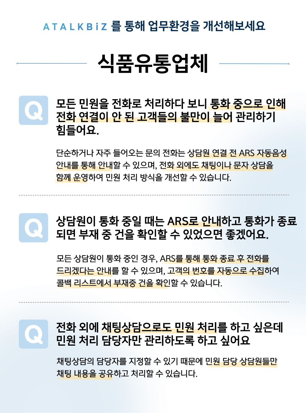 - 단순하거나 자주 들어오는 유형의 문의 전화는 상담원 연결 전 ARS자동음성안내를 통해 안내할 수 있으며, 전화 외에도 채팅이나 문자 상담을 함께 운영하여 민원 처리 방식을 개선할 수 있습니다.