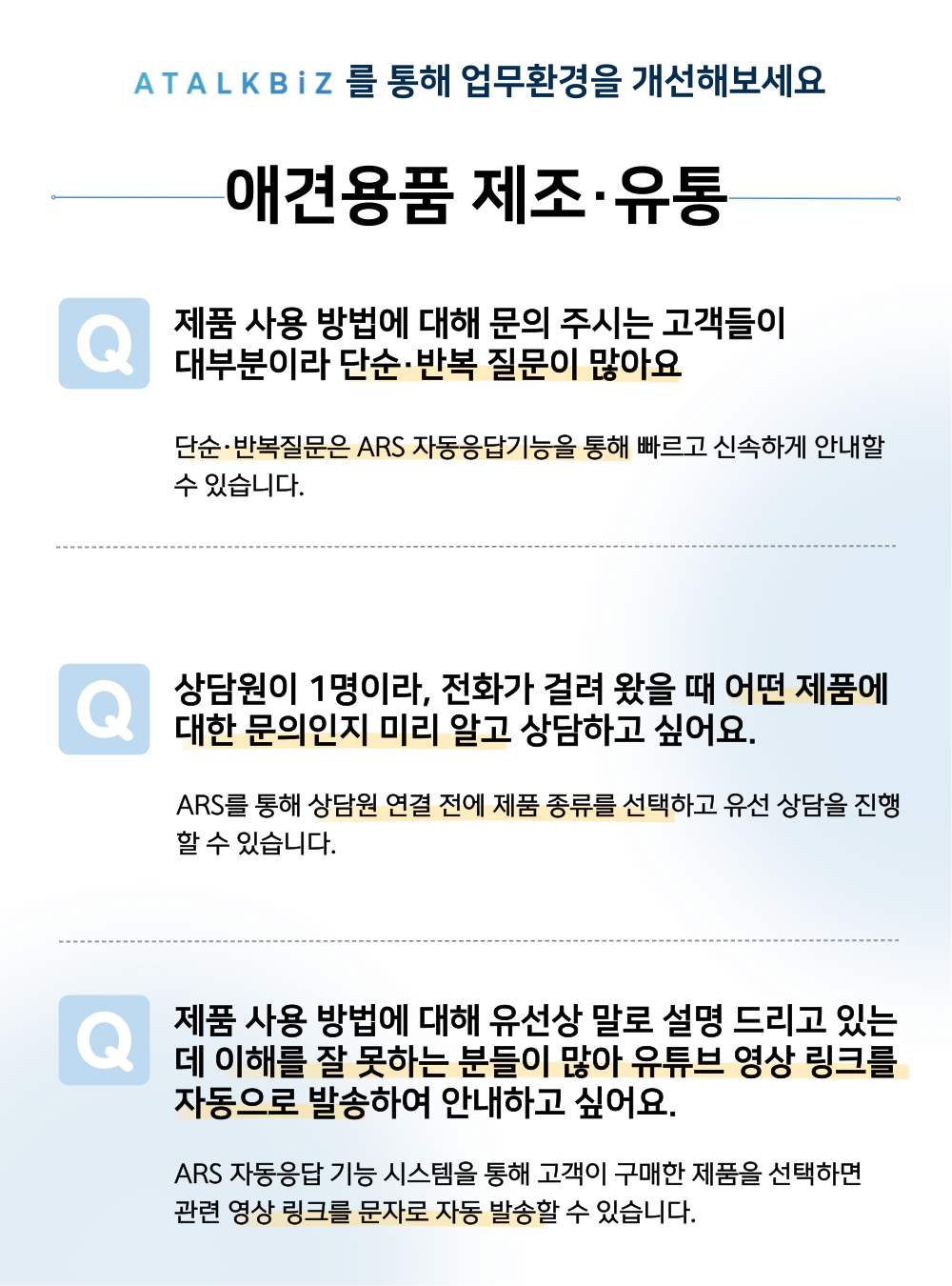 • ARS 자동응답 기능 시스템을 통해 고객이 구매한 제품을 선택하면 관련 영상 링크를 자동 발송할 수 있습니다.