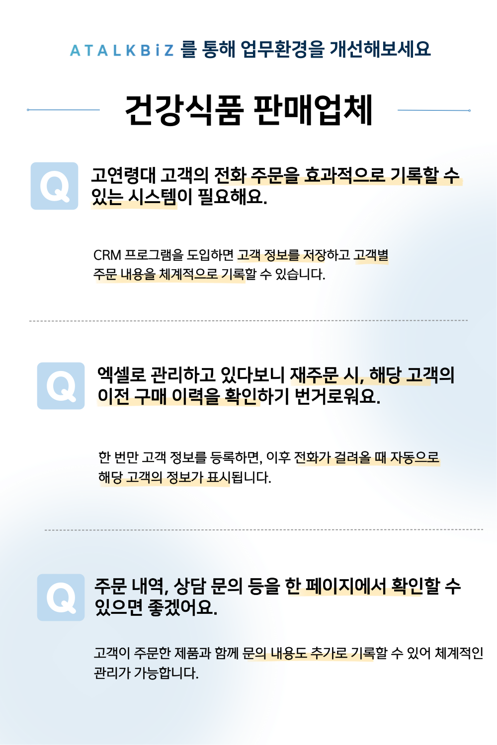 • CRM 프로그램을 도입하면 고객 정보를 저장하고 고객별 주문 내용을 체계적으로 기록할 수 있습니다.