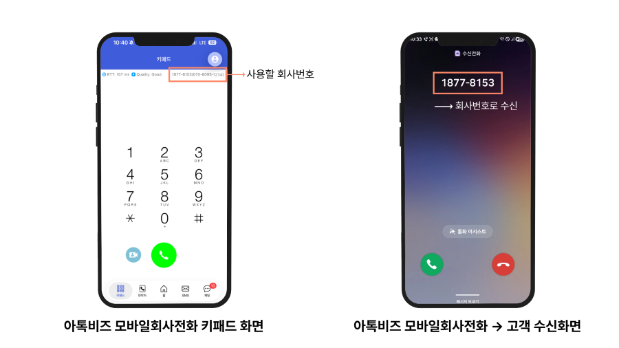 방식: 스마트폰 앱 또는 PC와 연동하여 회사번호(070 또는 대표번호)를 수발신하는 시스템이에요. 여러 직원이 같은 번호를 공유할 수 있고,