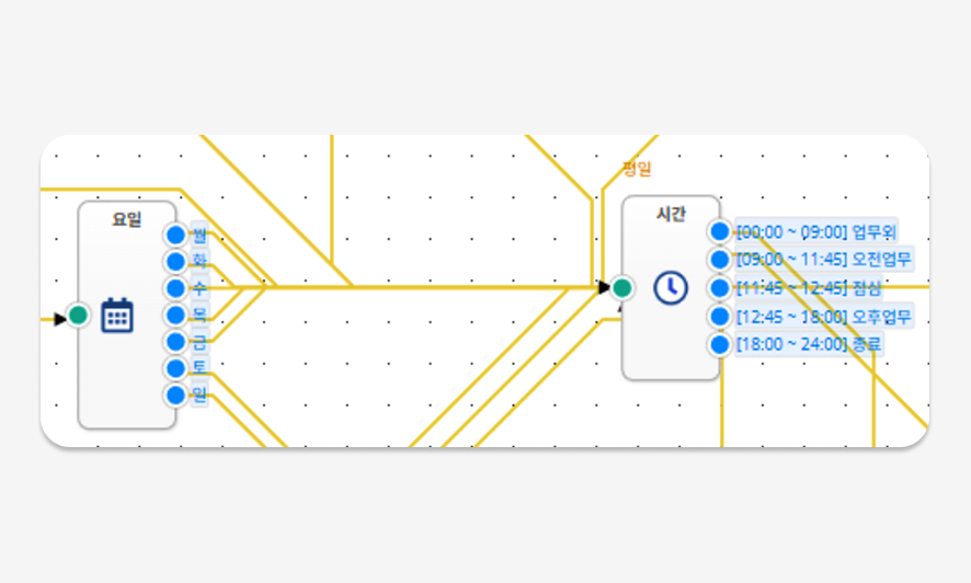[월, 화, 수, 목, 금] 요일을 지정한 후, 시간대별로 각각 다른 안내멘트를 등록하여 송출할 수 있습니다.