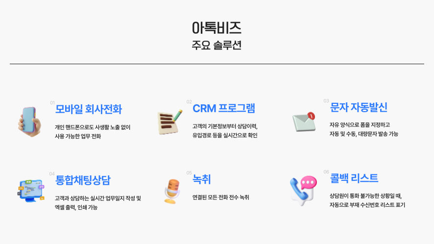 아톡비즈는 ARS(IVR) 뿐만 아니라 CRM(고객관리프로그램), 전화 연동, 통합상담, 보이는 ARS 등 다양한 솔루션을 제공하고 있습니다.