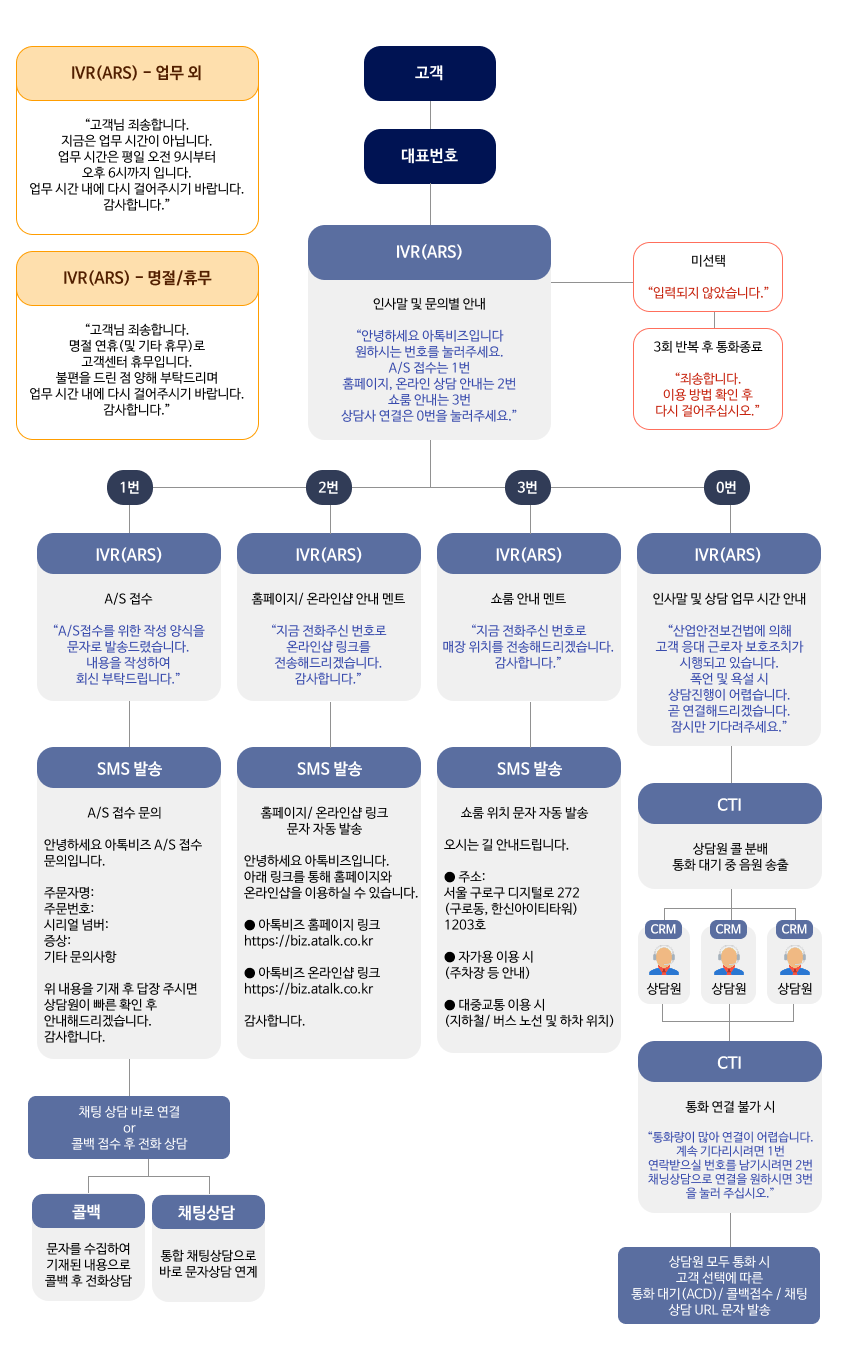 - 업무외시간 | "안녕하세요 아톡비즈입니다. 현재는 고객센터 운영 시간이 아닙니다. 운영시간은 평일 9시부터 18시까지입니다. 콜백을 등록하시려면 1번을 눌러주세요."