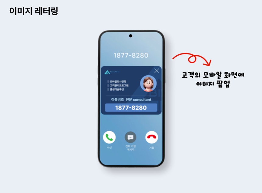 이미지 레터링은 회사에서 보여주고 싶은 이미지를 고객의 모바일 화면에 표시하는 서비스로 브랜드의 신뢰도 상승 및 통화 부재율 감소에 효과적인 서비스입니다.