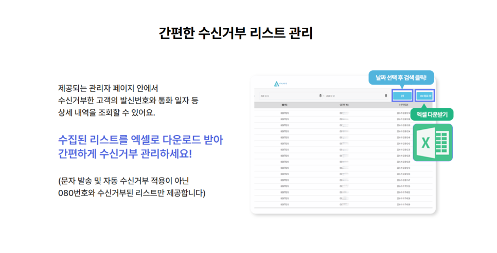 아톡비즈 080 무료 수신 거부 서비스는 인터넷을 통해 24시간 언제든지 개통이 가능하며, 관리자 페이지를 제공해 수신 거부 리스트를 실시간으로 확인할 수 있습니다.