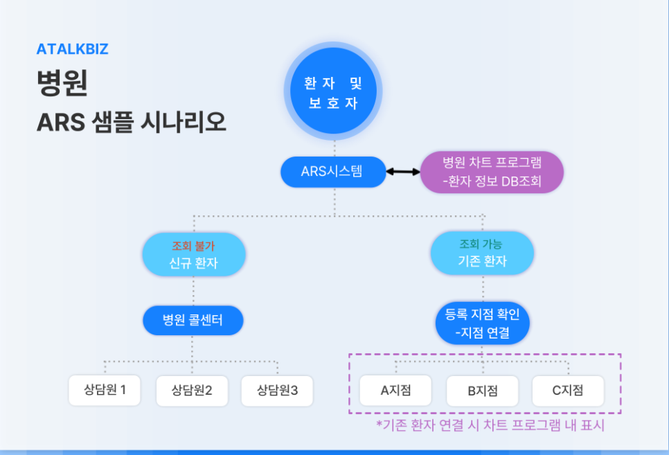 이러한 상황을 해결하기 위해 아톡비즈는 병원 차트 프로그램과 연동하여 환자 상태와 이력을 구분하고, ARS를 통해 콜 흐름을 자동으로 분리할 수 있습니다.