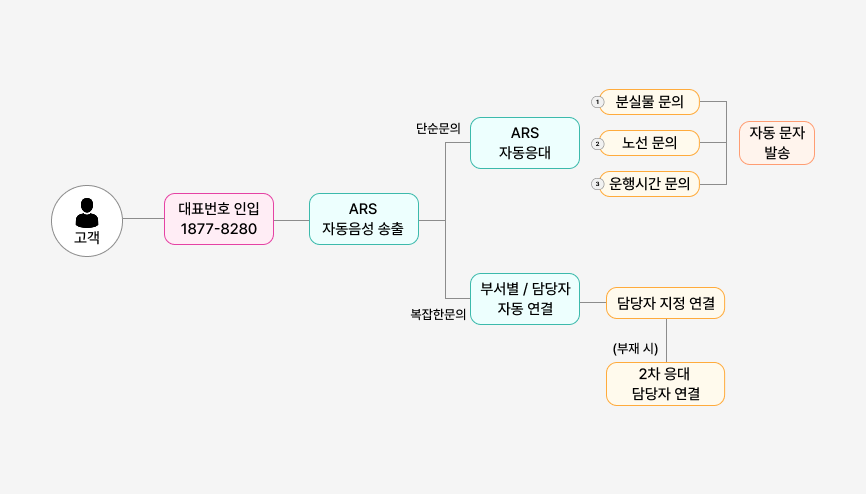 ARS에서 분실물, 노선, 운행시간 등 문의를 사전 분류하여 단순 문의는 자동 안내로 처리됩니다.